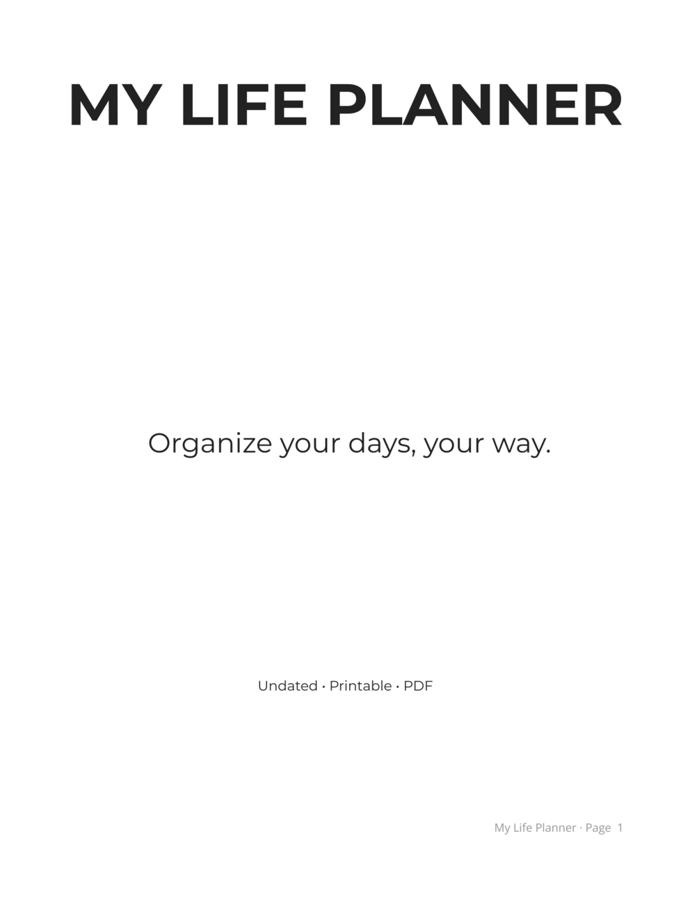 A printable life planner designed to help you organize your days your way. Undated pages for flexibility, with tools for setting intentions, staying productive, and practicing self-care.